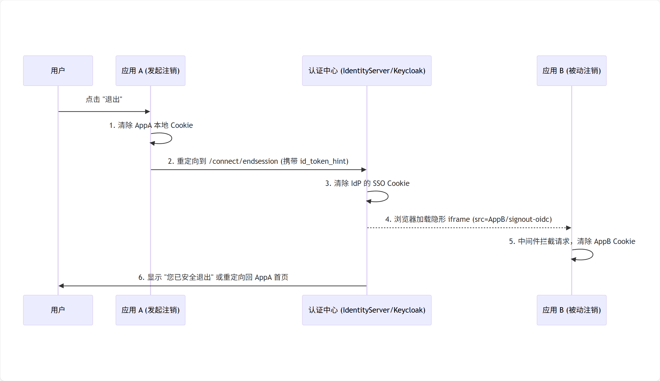IdP-->>AppB: 4. 浏览器加载隐形 iframe (src=AppB/signout-oidc)
