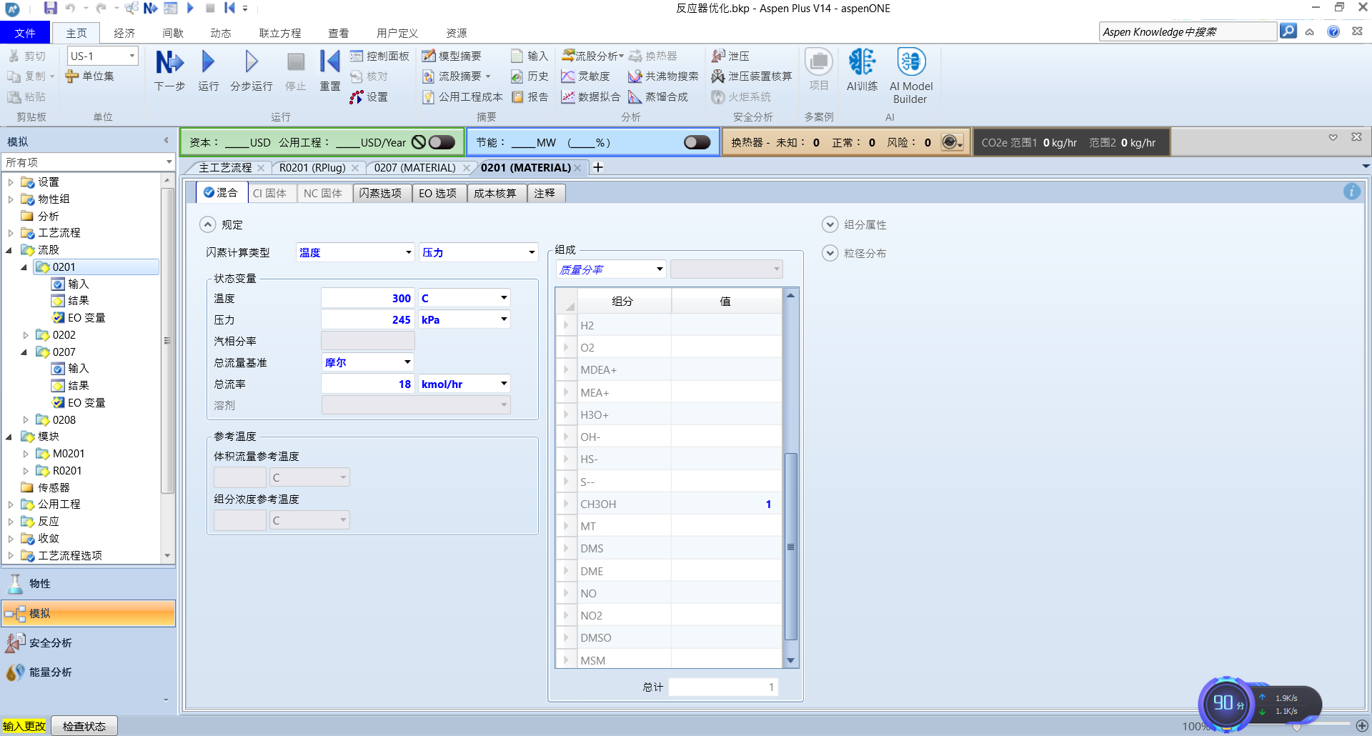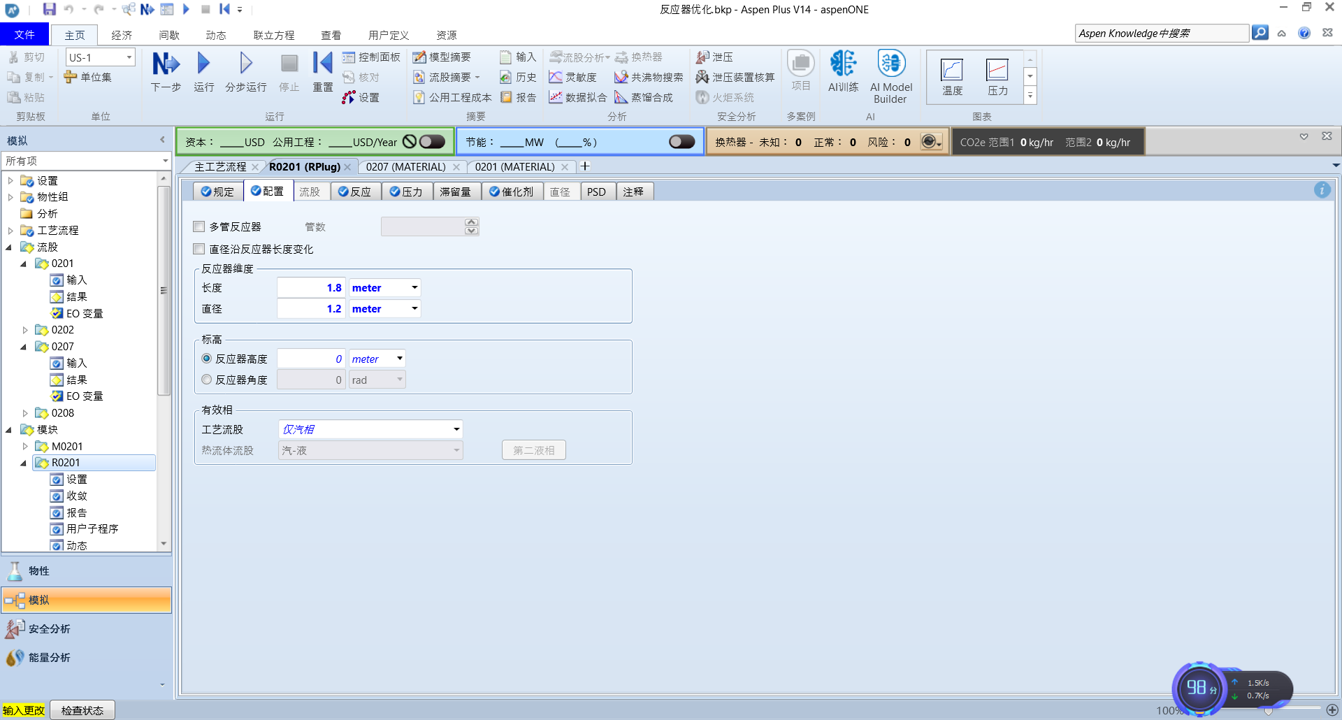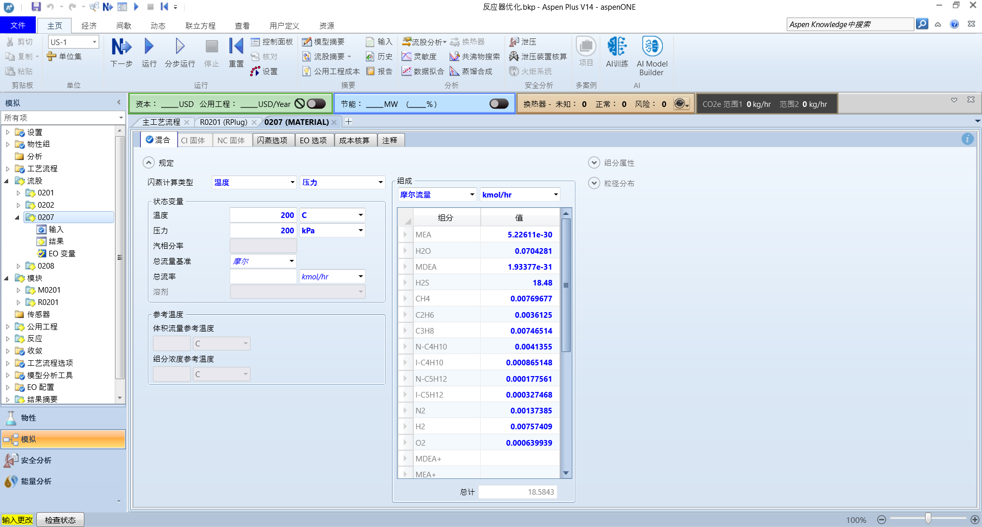 这里,我们将温度设为200℃,长度直径分别为1.8,1.2,长径比为1.5,压力为180kpa,甲醇流量为18kmol,运行可以得到DMS的含量为0.08kmol(很明显不符合)
