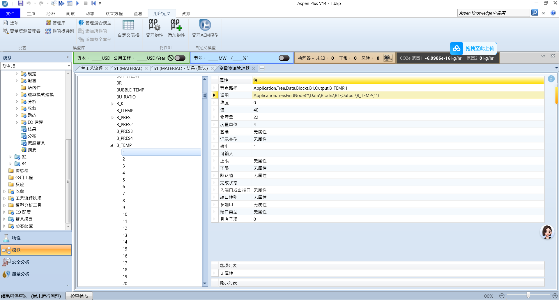 当我们使用 Python 连接 Aspen 时,最常见的操作就是抓取某个变量的数据。 例如,我们想获取模块 B1 中塔板 1 的温度(如下图所示):